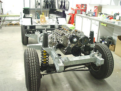 This image shows the new drive-train installed into the rolling chassis. You can also see the new stainless steel fuel lines are in place and will now bee hooked up to the fuel rail on the engine. Next up the stainless steel brake pipes will go into place and then the newly painted body panels will start to go into place.