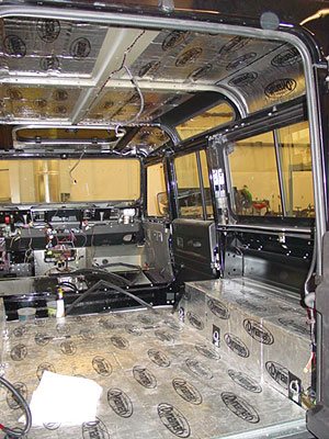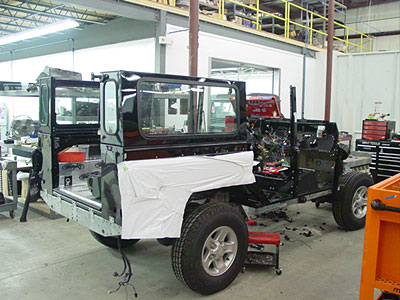 Here you can see that the majority of the body has been assembled and we have added a layer of sound reduction material to make the inside of the 110 as quiet as possible. At this stage we have also pre-run all the stereo wiring for the upcoming sound system, and as you can see the doors are now in place. Next up we will start installing the interior trims and those luxurious leather seats.