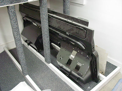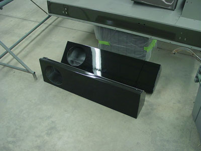 Here you can see the new subwoofer boxes that will hide behind the jump seats in the rear of the 110. They have just been primed and painted in Black in our in house paint department. These will give great sound to the system from the two 8" subs and won't take up any useable room in the back. Modern slim-line subwoofers now allow us to hide subs in places where we never could before, giving the customer better sound with a more factory look to the installation.