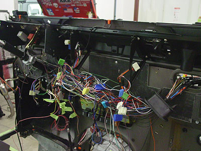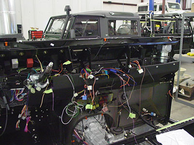 Here you can see the bulkhead is out of our paint dept. and has been loosely installed onto the frame. At this stage it is time to start wiring up the 110, but because the owner of this 110 wants it fully upgraded that means a lot of custom work for the electrical system. This truck will have power locks, power windows and will be EFI with an automatic. Land Rover never made a harness that did all that, so we start with a late model harness and modify it to be what we need. In the middle of the job it looks like a spaghetti mess...