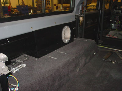 Here you can see the rear body tub has been restored and painted in the cool black color that will set this 110 apart and installed on the frame. At this stage in the build up we will also mock up the rear jump seats so that we can build the subwoofer boxes that will hold an 8" subwoofer on each side, but unlike stereo shops our subwoofer boxes will not be seen and will not take up and extra space in the cargo area. All the seating and cargo storage area will remain, you'll only hear them in the great quality sound, not see or have to deal with them.