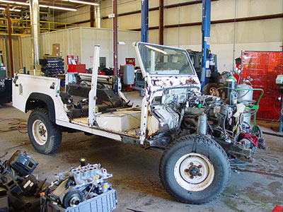 After the axles and such are rebuilt they are installed onto the new frame to create a rolling chassis. Along will upgrading the front brakes to vented rotors and converting the rear axle to disc brake instead of the stock drums, we are also using some upgraded springs for a mild suspension lift and Bilstein shocks for better ride and handling. While this frame is being made into a rolling chassis other work continues all over the shop on this project. Our in house paint shop is busy putting the primer and paint on the new steel parts and the mechanical side is busy setting up the new 1.4 ratio transfer case and the ZF automatic (you can see the gearbox and transfer case going together in the background). Next up we will get all the new stainless steel brake and fuel pipes installed on the frame and then start to construct the body.