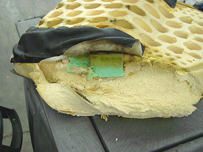 Here you can see the foam that was removed. This seat had a poor attempt at a repair (the green foam), but it didn't work and when the seat foam gets this nasty it isn't repairable.