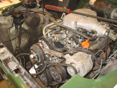 In the engine bay the new AC system is going into place and the needed tune up and service parts are being added to make the engine run correctly.