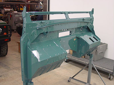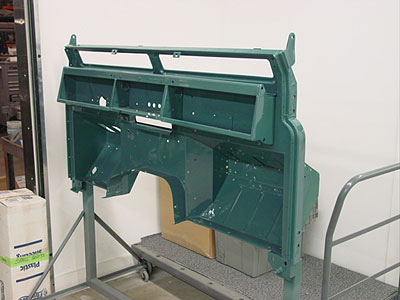 Here you can see the completed bulkhead. We have submerged the areas that usually rust in epoxy primer, across the top and down both sides. The dunk tanks, as we call them, get primer into places Rover never thought possible for great rust prevention and we have topped that off with a killer paint job in the customers chosen color. The owner will be doing his own assembly, but we have attached the panels that need to be hammer riveted on for him so that all the details of the bulkhead are correct and now it is ready to go back into the truck to complete the DIY restoration. Next we will package the bulkhead back into its crate and get it on the road back to SC.