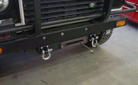 As this 110 is headed for the beach we need to set it up with the gear needed to get an over-sand permit. That means some pretty basic things like the ability to get the truck "unstuck" in case it becomes stuck. That means it needs some recovery equipment and safe and secure recovery points front and rear. Here at the front of the 110 you can see we have added some ROX recovery points to the winch plate to cover the front end...