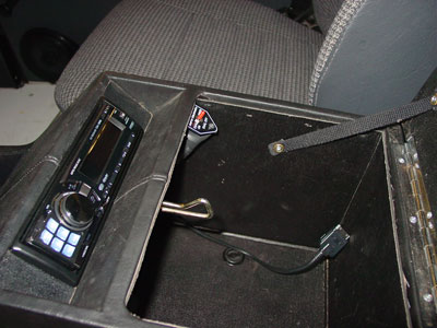 The control for the battery manager is mounted in the cubby box and keeps the second battery as a back up. So if you end up playing the music on the beach a little too long, you won't have to go looking for jumper cables. The system automatically kicks in the second battery when you start the vehicle, so you won't get left without power. This image also shows the new Alpine head unit, with satellite radio and iPod capability. Simply plug your iPod into the cable in the cubby box and tuck it safely away. All your iPod functions are now controlled by the radio itself for hours and hours of music.