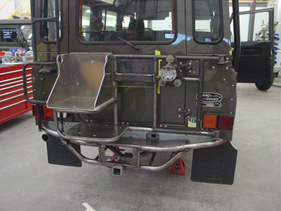 At the rear of the 110 we have removed the factory tire carrier. We will be fabricating a replacement that is a swinging unit that moves with the door. It will not only hold the spare, but will hold 10 gallons of diesel fuel, a storage box and mix-gas for the chain-saw that will be mounted inside the cargo area.