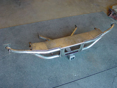 While the automatic set up is installed the custom fabrication work begins to make everything for the 110 that the new owner wants. One of the items the new owner wants is a rear mounted winch, so we have fabricated our rear step/tow bumper that houses a Warn 9000 winch. It mimics the look and function of the stock bumper, but it is all new construction. This image shows the bumper complete and ready to head to zinc and powder coating.