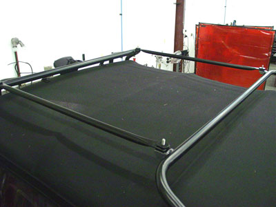 The owner of BR#2 frequently takes the roof basket off so that the truck can go into lower garages, so to make that easier we have installed some simple tie bars that connect the rear ladder system to the front bar. These are bolted in place with a simple nut system so that the basket is easy to take on and off with simple tools. Its a simple solution to something that can be a headache without the cross bars holding things in place. The cross bars also allow the truck to be driven without the roof basket if need be.