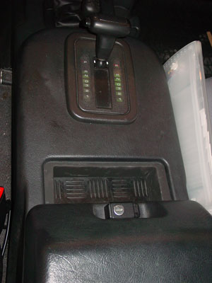 Here you can see the center console back in place. The radio is no longer in the factory location, so we have made a small storage box for coins or whatever that makes the old radio location good for storing small things.