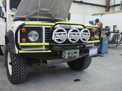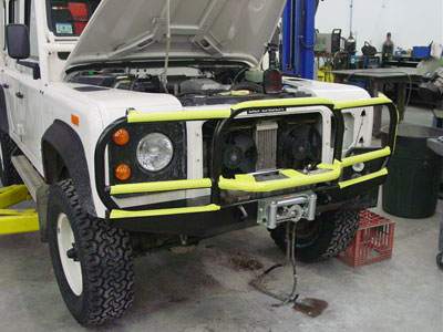 Here you can see the front end of the 110 coming together. The bumper, skid plate and the 3 Hella 4000 lights have been installed and are looking good. Next up we will go inside the 110 and start making additions there, like Sirius satellite radio and get started on the wiring for the upcoming LED auxiliary lights.