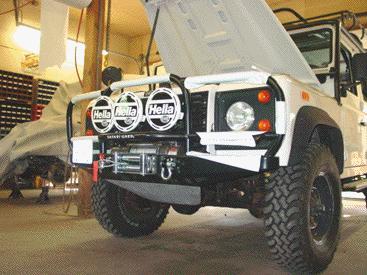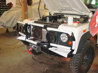 On the outside the 110 is also receiving some new touches. Here you can see that the new front bumper and skid plate have been installed. We also converted the turn signals (they were originally in the cheesy factory bumper) so that the 110 is still correct with twin park and single turn signals up front.