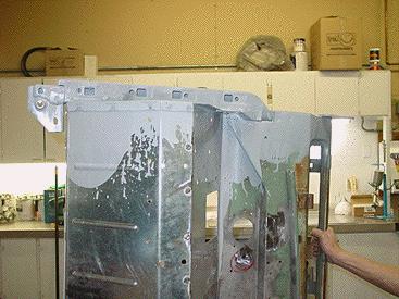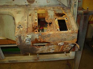 Here you can see the floor section on the LH side has numerous holes and the lower section is rusted through. Most shops would just put horrible pop rivet patches all over this bulkhead and not truly address the rust, but with our bulkhead jig we can bring it back into top notch shape. The next step is to cut all the rust away and media blast the bulkhead to find the hidden rust and damage.