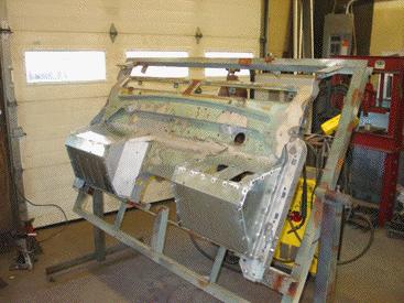 Above you can see that we have set in the repair panels for the kick panel, footwells and top sections and tacked welded them into place. The jig arms have been removed and what you are left with is starting to look like a complete bulkhead again. Now that everything is tack welded into place we will remove the temporary fasteners and duplicate all the factory spot welds with the tig welder. This will give the bulkhead its strength and a correct look. The next step will be to make the required modifications that the customer desires, such as a lager opening for the brake pedal box for power brakes, the opening for a Mansfield heater, etc. We do these mods now so that all the holes that need to be in the bulkhead are there before the dunk tank process and the primer coat, thus giving the steel better protection.