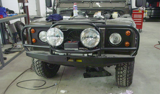 Here you can see the new ROX front bumper going into place with the Warn 9000 winch and the customer's Light-Force HID lamps. Up next for the front end will be to install the composite fairlead and the new winch rope and then we will install the bumper's skid plate the RoverTracks HD drag link and the ROX tie rod guard to make the steering set up near bulletproof.