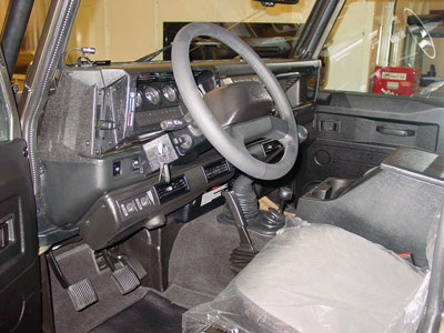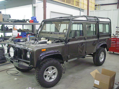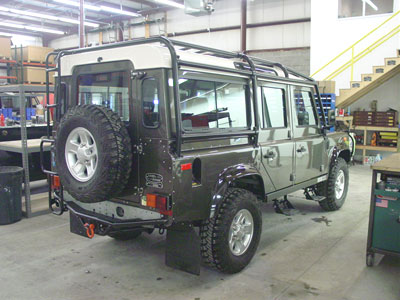 This images shows the 110 Wagon a little further along. The fenders have now been painted and installed and all the wiring run in them. The AC parts have gone into place as well as the safari cage. Next up the rear step, roof basket and rear ladder will go on to dress up the exterior and then we will start to install the black leather seats and get the sound system and other options wired in and ready to hook up.