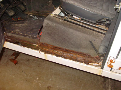 The bottoms of the T supports show some pretty nasty rust issues and the interior seating is starting to sag due to its age and use. The good news here is that we will be taking out all the carpets and replacing them with new and getting the seat frames restored and then topping them off with new seat upholstery in a nice black leather. The rusted T support is also history and will be replaced with all new steel before it is epoxy primed and painted in Willow Green for a really cool and one of a kind NAS 110.