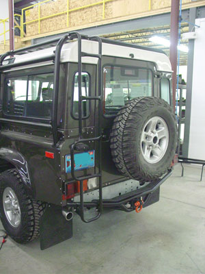 Out back we have started to get things finished up as well. The new style rear door has been assembled and installed, the lights have been hooked up and the freshly powder coated rear ladder has been installed on the step and tow bumper. A simple, but functional, rear recovery point has also been installed in the Class III hitch, just in case the 110 has to give anyone a tug on the trail.