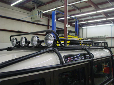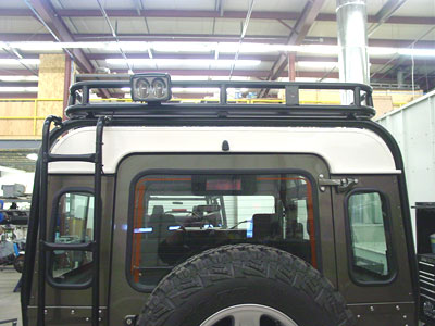 Here you can see the often copied, but never duplicated, ROX roof rack has come back from the powder coater after a layer of zinc and satin black powder coat. We have installed it and set it up with a Work/Reverse lamp that can be used for light to help set up camp at night, or just for added light as you shift into reverse. The lamp is wired so it will do both jobs depending on what you need at the time.