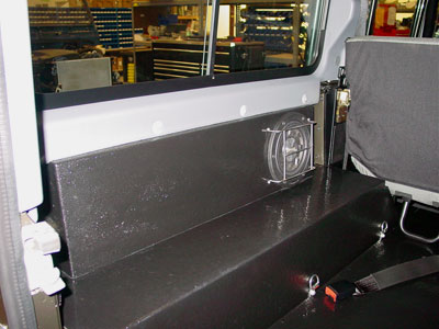 In the cargo area of this 110 we have now installed the custom subwoofer boxes (one 8" subwoofer on each side of the truck) that have been Rhino-Lined for the ultimate in protection. The subs and the custom made stainless steel grills have been installed, as well as 6 cargo tie down points so that all types of gear can be carried and strapped down without any problems at all, and if something spills... just hose it out, that is the beauty of the truck bed-liner.