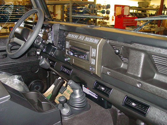 Here you can see the interior coming together. We did a little custom touch on the center dash on this one. Inspired by the "Black" 110s in the UK that had silver accents to the interior, we have done the center dash up in the base coat that makes up the Willow Green color, but not the clear coat like the exterior, so it gives the interior a hint of the exterior color, but it is subtle and breaks up all the black in the interior. The Alpine flip out touch screen head unit has been installed along with all the switch gear for the lockers and additional lights. As you can see, in an ECR restoration everything blends in and looks factory. All the controls for the ARB lockers and the Lightforce lights can be seen in this image, but because we install all those systems tastefully and integrate them into factory switches the interior does scream "add-ons". It all looks like it was meant to be there. The truck still has dust from the assembly process on it, but it will have a trip to the detailer before it is made ready for the customer.