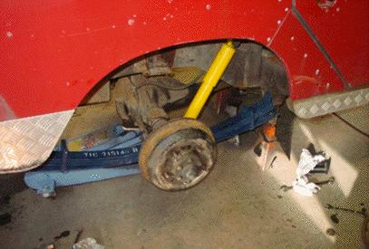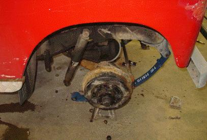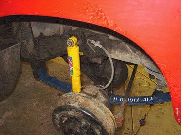 This image shows the completed front suspension with the new parabolic spring, upgraded shocks and urethane bushings. While the suspension was being buttoned up we also did a few small service items such as setting the timing and replacing some worn out steering components.