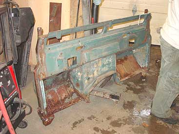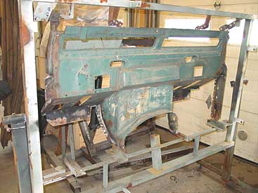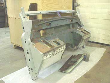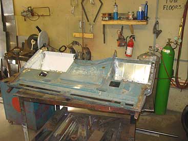 This image shows the bulkhead nearly complete. The door post, feet and floor sections are now in place and all the damage and rust has been corrected. The next step is to fabricate the correct series door seal retainers on the door posts and then the bulkhead is headed for the dunk tanks.