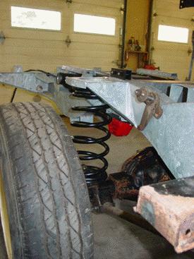 Here you can see the new galvanized chassis, fully set up and Stage II suspension nearly ready to mate back to the body. We still need to run the new stainless steel fuel lines and do a few other work orders, and then we will reinstall the 110's body.