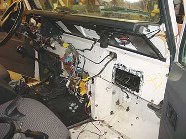One of the aspects of this 110 that was damaged was the HVAC system. That stands for Heating, Ventilation and Air Conditioning. The HVAC system in a 1993 was lame the day it was new, and in some way Land Rover must have known this. They stopped making a good number of the needed replacement parts to keep the systems going a long time ago. So what do you do when you want good AC, good heat and parts that will be available long term? Unfortunately you do what you see in the image above, you gut the factory system and install modern Defender equipment. As you can see above we have removed the dash system with its over complicated air ducts and we are back down to the bulkhead.