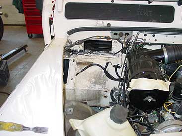 In the engine bay the same thing happens. All of the HVAC system parts are removed to get ready for the late model heat and AC system. Here you can see that we have removed the heater matrix and now we'll make the minor modifications to the bulkhead, clean the area and get ready to install the new parts.