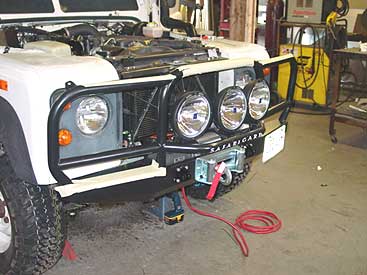 On the exterior of the 110 we are installing some upgrades as well. Here you can see that we have installed a new Safari Gard front bumper along with a Warn 9000 winch. The bumper is topped off with 3 Hella 4000 lights to turn night into day while off roading. We also added a set of ECR ROX recovery points to add flexibility to the customers winching needs.