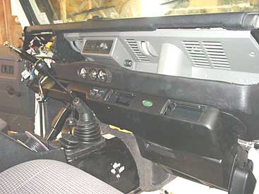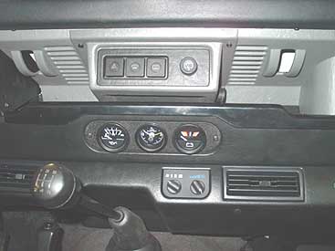 In the center dash of the 110 you can see the relocated systems. All the controls and features of a standard NAS 110 are here, they are just arranged differently. All 3 gauges reside in the lower dash area and work as normal. The controls for the hazard lights and defrosters are mounted on a factory looking panel in the middle of the dash, as are the 12v power point and the rear wipe/wash control. The new AC controls are located just below the gauges and the fan and heater controls are now located in the factory Defender 90 positions at the drivers finger tips.