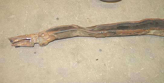 The main issue is the gearbox cross member, or better yet, what is left of it. This piece really takes the abuse when off roading, and as you can see in the image above, the weak stock gearbox cross member has been pounded flat and is in bad shape. Installing a new gearbox cross member is not an option because the customer plans to continue to off road this great looking 88, so we have to make something better than the factory did.