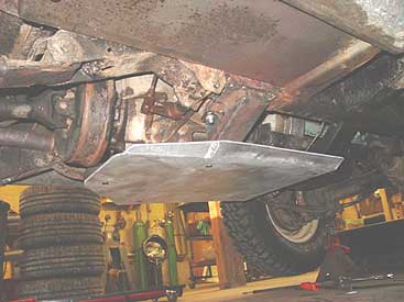 Here you can see the completed skid plate that will keep off road obstacles from getting into the area between the engine and gearbox cross members. It will also protect the gearbox and transfer case and keep the gearbox mounts in tact. A previous hard hit on some off road obstacle had broken the gearbox rubber mounts.