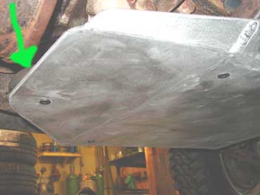 The tail end of the plate trails away and protects the transfer case from harm. The small hoop you see in the fabricated cross member a few pictures up is what reaches back to hold the tail end of the skid plate, as without it the area near the hand brake would have no strength. The green arrow points out the rear edge of that hoop on the cross member. The alloy skid plate is easily removed so that you can service the Rover and adds as little weight as possible while still doing its job.