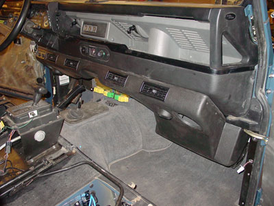 The front of the cabin is coming together as well. The AC system has been set up and tested and all the electrical systems have been brought up to snuff. We even set up the new rear door's wiper motor to work with the '97 NAS 90s multi-function ECU so that the rear wiper will cycle periodically, unlike the typical Euro Defender where it is either on or off.