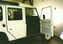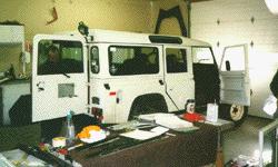 Here the 110 is brought into one of the service bays and the old rusting doors are removed. We not only replace the doors with new, but we make sure the new parts will outlast the originals. We seam seal, undercoat, epoxy prime and detail all the surfaces, inside and out. Your local body shop won't do that for your Rover... but ECR will.