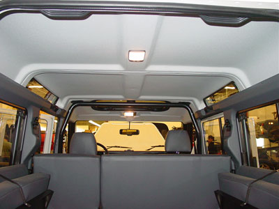 Cargo and rear passenger area, with updated rear door, sturdy bench jump seats and 2x 8" subwoofers for great sound reproduction.
