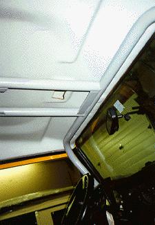 With everything in place the hard top was installed on ECR 4 and the front and rear headliners and roof side trims were installed. This image shows the front headliner and the front hoop of the roll cage in place. The twin bars in the middle connect the structure, as well as give a place to mount the electronics such as the CD player, CB, etc. Watch for more images as the interior and electronics package is added.