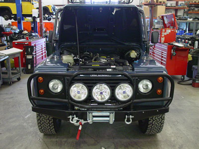 To aid in any off roading that the 110 gets into we have added a ROX front bumper with a Warn 9000 winch, 3x Hella 4000 lights, recovery points and a steering guard skid plate. This front end set up not only looks great but also is fully functional.