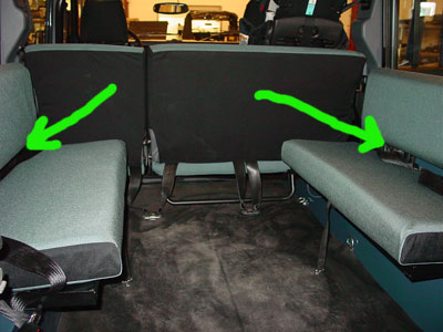 Here you can see the updated rear door and rear door interior panel. This set up is much stronger and longer lasting than the original 1993 parts, and looks better as well. You can also see the new jump seats and the cargo area tie downs that we have installed in the rear as well.