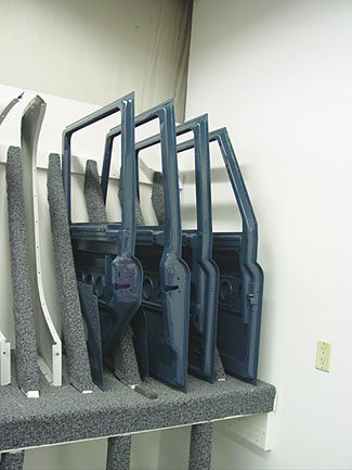This image shows the Arles Blue 110 #4/500 starting to look like a 110 again. All the body work as been done and everything has been epoxy primed and then painted and is now starting to be assembled onto the chassis. The difference here is that we take a number of extra steps,. far beyond what the factory in England does, to make sure that the body lines, door gaps and the way to doors open and close work correctly. This helps the ECR 110s work better (no door slamming required) and it helps to prevent water leaks and keep the truck sealed up nicely
