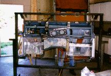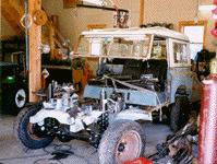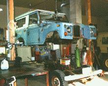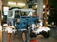 Here the rusted old chassis is been removed and the body set up on a newgalv. coil chassis for its refurbishment. Other work will include a newTurner 2.25, Mansfield heater, wiring harness, etc. In a few weeks it willbe road ready again, and ready for years of updated service.