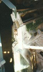 Next was the bulkhead. The bulkhead on this SIIA was really rusted. It not only needed footwells and door posts. but we had to fabricate sections ofthe upper structure and the entire door seal lip. In this image you can see that the entire door post had to be removed and all the rust cut away in favor of new steel. Fortunately our bulkhead jig keeps everything linedup perfectly even during these extensive repairs and the end result will be a better than new bulkhead.