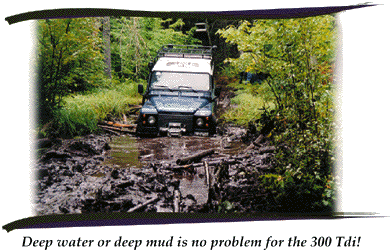 It is hard to convince those who haven't driven a Tdi off road just how superior it is to the Rover EFI V8. The general idea seems to be that because Land Rover installed the Rover V8 in the Rover, that it must be the best thing going. In our opinion this is not the case. (actually Rover hasn't installed the V8s into the Defenders (other than NAS spec units) since the mid 1990s!) The low end torque of the Tdi (195 ft. lbs. at just 1800 rpms) means instant ability to climb any obstacle with plenty of power for anything a Rover can do. Who needs a V8! Those who do "mud bog" or "monster truck" type events may want V8 power to "put the hammer down", but we find that rock crawling, trail riding, expedition work and all aspects of off roading that most Rover owners are into are all greatly enhanced with the Tdi. The Tdi has so much torque at idle that you'll no longer need to rev. up your V8 to get into the power band, this makes your driving smoother and even saves your clutch. The engine can idle over almost anything, and it will lug down and just keep going even without your foot on the clutch or the throttle. One of the small benefits of the Tdi off road that is a welcome relief is the fact that is doesn't overheat, and it doesn't build heat while idling on the trail. This means you'll no longer bake your feet from V8 exhaust heat! The Tdi is very happy to sit and idle on the trail all day long if you are on a trail ride with a large group, and it won't pump heat into the cabin while it idles. Now lets talk about water and mud... Try taking your EFI V8 up over the headlights in water and letting it idle there. In a few minutes or seconds the EFI computer will fill with water, short out and you'll be swimming for your buddies winch cable and trying to figure out how to tow your rig out off the trail and back to your dealer. With the Tdi's lack of ignition parts it just sits there begging for more, if you don't drown your air intake you're all set.