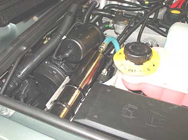 To locate the remote reservoirs for the Bilsteins is tricky in the confines of the Disco II engine bay, but by moving a few things out of the way we were able to get it into a good position that keeps all the other systems serviceable. Above you can see the LH shock reservoir mounted on our newly fabricated and painted bracket.