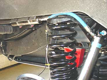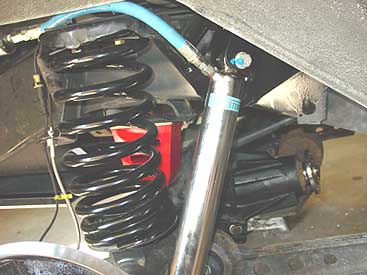 This image shows the completed front suspension. The Bilstein shocks have been installed as well as the longer bump stops and everything is finalized. The longer stainless steel brake flex lines will be added shortly.
