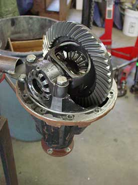 Once the diff is out and on our bench we can strip it down to the bare case and get it ready for the upgrades. As this is a gearing change (3.54 to 4.11), as well as a locker install, we not only need to change the center section, but we need to remove the pinion and install the new 4.11 pinion and set the pinion depth so that the gears will ride correctly for long term operation and smooth quiet running.