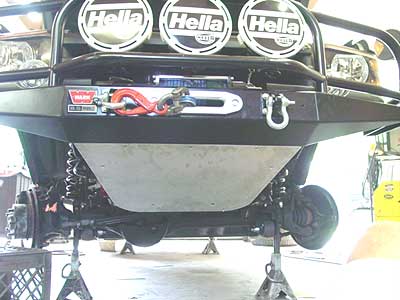 Here you can see we have removed the stock bumper and spoiler and added a SG winch mount front bumper and skid plate to match the rear bumper.